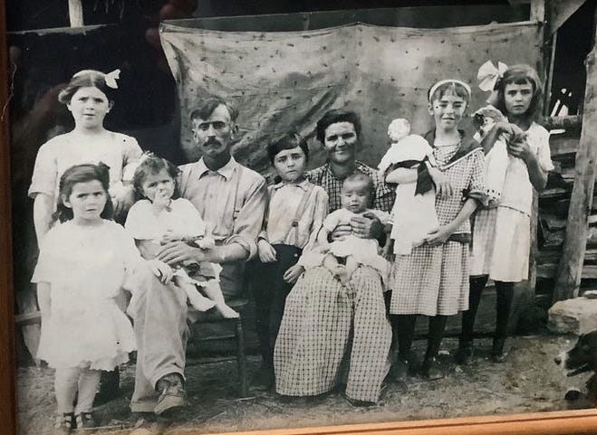 Green family, Benton County, Arkansas, c. 1914. Left to right: Ruth, Mary (in front of Ruth), Alice (Ggma), Thomas, James “Man” Vilas, Virginia Belle, Andy, Effie, Lillian, Phydeaux